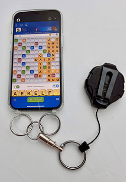 The Retractable keychain attaches to a round pull-apart key ring. This is a quick-release key holder that keeps you attached to your phone. You will need a couple of one-inch split key rings to attach to the plastic holes in the phone case. You may think that you'll get tangled up in the cord, but you won’t. Thanks to the placement and design of the holes, the phone sits securely in its plastic case and slips in and out of your pocket seamlessly. Also, thanks to the ingenious ratcheting design of the keychain, you will drop your phone a lot less....and when you drop it, it will retract or lock before it hits the ground. Click to view larger image.